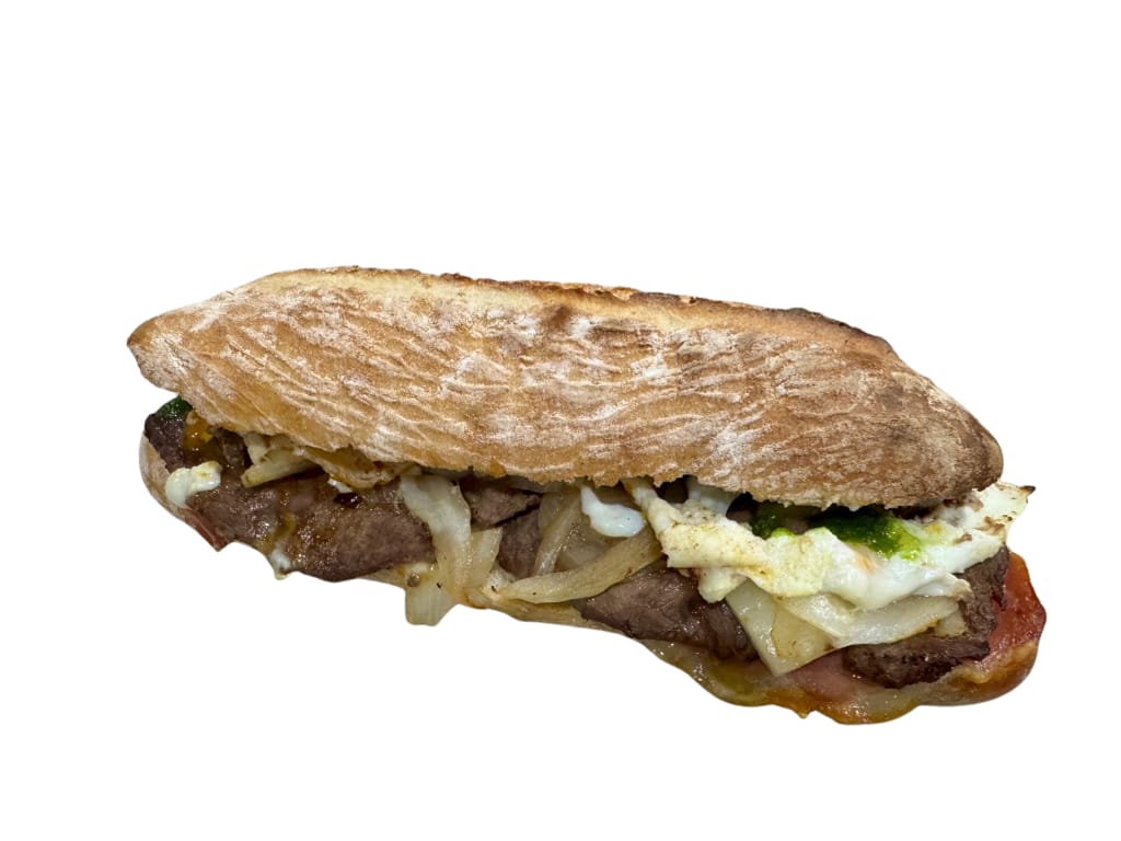 Bocadillo de entrecot de vaca, salsa verde, cebolla a la plancha, queso y jamón serrano.
