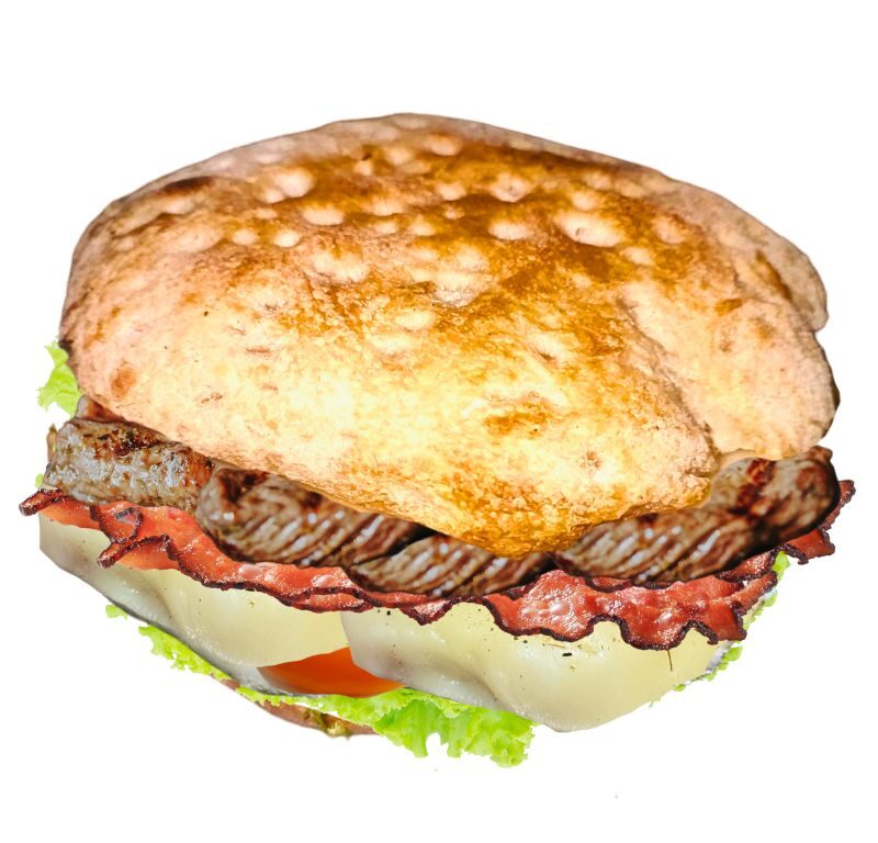 Delicioso pan de masa madre estilo pizza, relleno de pollo rebozado, lechuga, tomate, jamón York, queso fundido y mayonesa. Crujiente, jugoso y con un sabor que lo hace único.