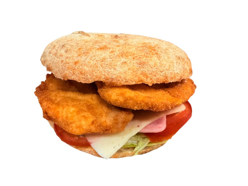 Elaborada con pan artesanal de masa madre de pizza, crujiente por fuera y tierno por dentro, esta delicia está rellena de pollo rebozado jugoso y dorado, acompañado de lechuga fresca, tomate natural, una loncha de jamón York y queso fundido que se derrite entre capas.