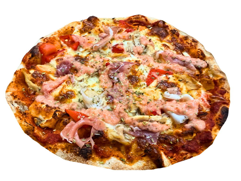 Pizza hecha con masa madre, tomate especial, mozzarella, queso de cabra, pollo, jamón serrano, pimiento, y orégano.