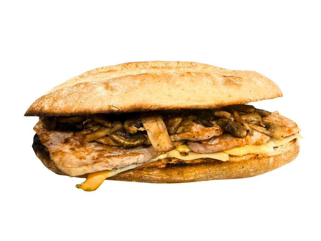 Salsa verde, pimiento, champiñones, queso, lomo y hiervas provenzal.